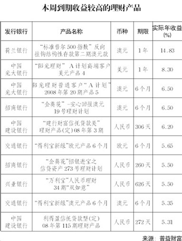 據普益財富不完全統計,本周(2009年5月1日至5月7日)67款銀行理財產品到期,到期的理財產品全部實現了預期收益,理財產品到期收益實現率達到了100%,并且未出現理財產品提前終止的現象。 本周到期的理財產品以信貸與票據資產類、債券與貨幣市場類為主,與前幾周相比,最大的區別是本周到期的信貸資產類理財產品均實現了預期收益并且未出現提前終止的現象。這主要在于部分理財產品在降息后發行,在理財產品設計中已經考慮了利率因素,特別是前期提前終止現象較多的銀行,目前其到期理財產品絕大部分在降息之后發行。 本周到期的結構性理財產品的掛鉤對象分別為利率、價格和指數,掛鉤標的的走勢與理財產品設計的獲利條件相符,所以到期也都全部實現了預期收益。不過需要指出的是,這并不代表結構性理財產品將不會出現零收益等不理想的表現。此外,到期的1款投資于收益權的理財產品也實現了預期收益,本周沒有證券投資類和新股申購類理財產品到期。到期收益較高的理財產品中,信貸資產類和外幣保證收益理財產品的占比仍舊最高。 截至2009年5月7日,正在運行的338款QDII理財產品中,20款理財產品實現了正收益,比上周大幅增加4款,其中花旗銀行與渣打銀行各占2款。中國農業銀行、渣打銀行、花旗銀行仍然占據所有正收益理財產品席位。得益于香港股市的凌厲漲勢,花旗銀行“施羅德環球基金系列-香港股票”理財產品本周漲幅高達17.12%,以43.68%的累計收益率重回榜首,遙遙領先其他QDII理財產品。 市場對甲型H1N1病毒的擔憂正逐步減小,相反本周隨著積極的經濟數據不斷公布,投資者的樂觀情緒得到進一步激發。盡管空方一直強調經濟下滑趨勢放緩并不意味著經濟好轉,但投資者卻不斷買入股票。美國商務部周一宣布3月份建筑整體支出數據6個月來首次出現增長,受此提振,美國股市三大股指周一收盤平均上揚2.86%。美國周三公布的就業數據顯示,就業崗位仍在快速下降,但降幅明顯趨緩,勞動力市場開始顯示出轉好的跡象,美國股市隨即積極反應,引領周邊股市同步上揚。截至周四下午6點,美國三大股指、歐洲指數、香港恒生指數本周漲幅分別為3.23%、2.90%、8.36%。 本周,海外市場漲勢喜人,因而有超過94%的QDII理財產品收益實現上漲,平均周漲幅為3.59%,QDII理財產品收益率曲線回升顯著。本周漲幅超過10%的理財產品有5款,其中4款均較大比例配制了香港股票。而近日臺灣與大陸達成簽署MOU意向的消息一經傳出,臺灣股市連日上漲,致使關聯臺灣市場的花旗銀行“施羅德環球基金系列-臺灣基金”周漲幅達到12.80%。在中資銀行的47款QDII理財產品中,所有理財產品凈值繼續保持在0.4以上。其中,3款理財產品實現正收益;7款理財產品虧損超過50%,占比為14.9%,比上周減少4款。外資銀行的291款QDII理財產品中,17款理財產品實現正收益,比上周增加5款,其余理財產品均跌破凈值;67款理財產品虧損超過50%,占比為23%,比上周大幅減少22款;除了1款理財產品累積虧損為60.31%外,其余理財產品凈值均在0.4以上,深度虧損的產品數量急劇減少。 此外,運行期在6個月至1年之間的QDII理財產品共45款,平均累計虧損23.09%,平均周漲幅為3.89%。其中,表現較好的是渣打銀行“開放式結構性投資計劃瑞銀彭博固定期限黃金超額回報指數(UTSN003)”產品,其累計收益率為25.89%;表現較差的同樣為渣打銀行理財產品,該理財產品是渣打銀行“開放式結構性投資計劃瑞銀彭博固定期限成份原油回報指數(UTSN004)”產品,其累計收益率為-54.05%。 運行期在1年以上的QDII理財產品有293款,平均累計虧損34.52%,平均周跌幅為3.55%。其中,表現較好的是花旗銀行“施羅德環球基金系列-香港股票”產品,其累計收益率為43.68%;表現較差的是匯豐銀行“貝萊德美林世界礦業基金掛鉤(IPFD1045)”產品,其累計收益率為-60.31%。