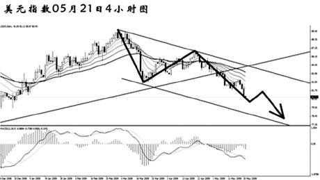 由于近期投資者開始對全球經濟復蘇的預期進行重新思考,市場避險情緒重新占據了上風,美元指數在創下4個月新低后展開反彈,并終結了連續三周的下跌走勢。 然而,美國公布的第一季度NAR房價年率下跌14%,跌幅創紀錄新高,4月零售銷售也意外下滑,而且初請失業金人數的增幅也超出預期,美國股市因此受到沖擊。上周道指總計下跌3.6%,標普500指數下挫5%,為近兩個月表現最差的一周,納指下滑3.4%,結束了周K線的“九連陽”。此外,費城聯儲上周公布的調查結果顯示,美國第三季度GDP預計將增長0.4%,此前預期為增長1.0%,這表明經濟復蘇的步伐將較此前預估的更為緩慢。 受上述因素影響,美元指數在跌破82.60的支撐后小幅調整,隨即加速下行,延續了短線良好的下跌主趨勢。從空間上看,下方除了去年底的低點77.60外已無明顯的強支撐。短線美元指數在均線系統的壓制下一路走低,斜率陡峭,且形成了一個新的下降通道。預計下周美元指數修正后將延續弱勢,仍以看空美元指數為主思路。