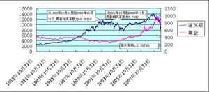 圖1是道瓊斯指數與黃金的相關分析圖,數據記錄是從1989年10月31日到2007年11月,兩者的相關系數是0.38789。