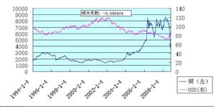 圖2是LME銅與美元的相關系數圖,數據記錄是從1994年1月到2008年12月。