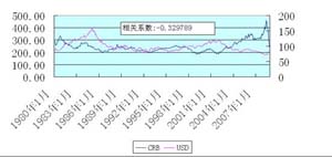 圖4是CRB與美元的相關系數圖,數據記錄是從1980年1月份到2008年底,它們的相關系數是-0.329789,是呈負的相關性。