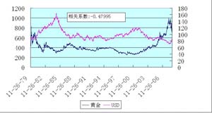 其次,在金融市場方面,如果美國經濟發展勢頭良好,則投資者會認為投資其他市場的回報率高于投資黃金,那么,大規模資金會撤出黃金市場,而涌向其他市場,從而導致黃金價格下降。從1979年到1991年,黃金與美元負相關性明顯。