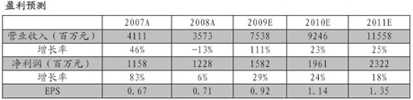 銀河證券預計,招商地產2009年來自于房地產的銷售收入約60億元,物業租賃5.5億元。2009年主營收入約76億元,歸屬于母公司凈利潤16.65億元,每股收益0.97元。