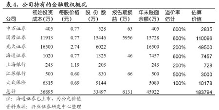 興業證券的研究報告稱,由于國企的優勢,大眾交通擁有了多家金融機構和上海較好企業的法人股,該部分資產的公允價值大大高于賬面價值。大眾交通現有賬面價值4.59億元的金融機構股權,其中海通證券已上市,價值7457萬,其余為國泰君安、光大證券等非上市證券公司,依照海通證券的溢價情況,粗略估計大眾交通金融股權的溢價為3倍左右,相當于增加資產價值13.7億,每股價值0.87元。