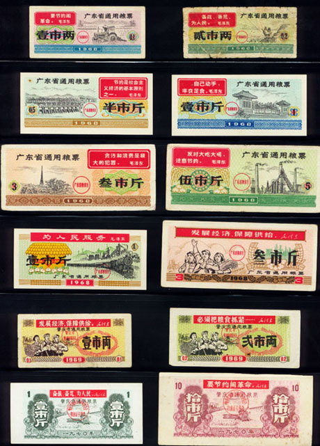 “文革”糧票大多出現在1967年~1972年,一般具有以下特點:首先是幾乎所有的“文革”糧票上都使用了“革命委員會”印章;其次是大部分“文革”糧票上都印有毛澤東、林彪的語錄,當年除了全國糧票中沒有“語錄”票外,全國各省、市、縣、區、鎮幾乎都發行過“語錄”糧票;第三是很多“文革”糧票上都印有工農兵高舉《毛澤東選集》和紅太陽大放光芒等圖案。由于“文革”糧票是“文革”動亂年代的“紀實文學”,具有現代文物的性質,因此備受收藏愛好者的青睞,其價格也一直高于其它時期發行的糧票。與郵票和錢幣收藏一樣,“文革”糧票里價值最高的是沒有公開發行過的樣票,如:1969年版湖北省集體用糧定額糧票(樣票),全套3枚,面額分別為50斤、100斤、500斤,市場參考價每套約為1000-1500元;還有江西省1968年版2斤錯票,因票面上“備戰、備荒、為人民”中的“荒”字印錯了,將上部的“芒”印成了“蕓”,有關部門責令將印好的票樣銷毀,但仍有不足10枚流落在外,現該票已成為江西省糧票中的特級珍品。但目前還有一些存世量較大的“文革”糧票售價并不高,如:四川長寧縣1969年1兩、2兩、半斤、10斤4枚一套的“語錄”糧票,現在四川的收藏市場里,每套僅售2-2.50元左右,其后市應該看好。