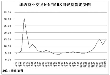 以年收盤價定位連線,基本反映了國際銀價的長期走勢特征。白銀價格在1980年到達大牛市的高點41.50美元/盎司后,就跌入持續20多年的漫漫熊途,最低只有4美元/盎司。進入21世紀以來,隨著經濟發展和美元逐漸走弱,銀價開始緩慢攀升。遭遇國際金融危機重創后,目前再次走出活躍行情,突破14美元/盎司大關,正向15美元挺進,單月最大升幅達15.7%。 |