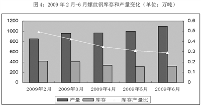 圖4:2009年2月-6月螺紋鋼庫存和產量變化(單位:萬噸)
