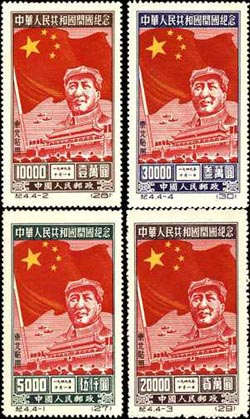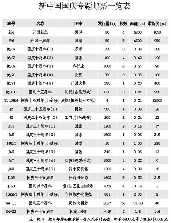 新中國的國慶紀念專題郵票始于1950年的紀4《開國紀念》,以后在國慶的一、十、十五、二十五、三十、三十五、四十、五十以及五十五周年又分別發行紀念郵票,至今共約19套之多。