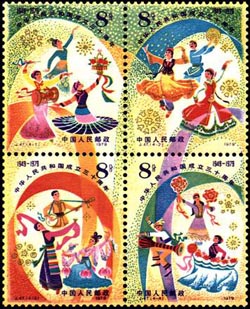 在這些郵票中,較為引人注目的當屬紀71選用著名畫家董希文的《開國大典》油畫,頗具收藏價值,而紀106和J47都采用了畫面圖案相連的連票形式,讓人有豁然開朗、耳目一新的感覺,其中紀106郵票為新中國第一套票面圖案相連的連票形式;再者就是1999年發行的這套枚數最多、面值最高的套票版張紀念郵票《民族大團結》了,以中國畫工筆重彩畫法設計,每個畫面均選用祖國各民族最富特色的服飾,由男女二人組成的各種舞蹈構圖,具有很高的觀賞價值,確實令人喜愛。