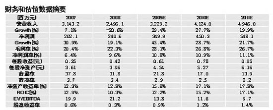 長江證券也給予公司較為樂觀的判斷,采用常規的PE估值,預計2009-2011年EPS分別為0.584、0.891和1.248元;鑒于公司為朝陽行業領頭羊,未來高成長比較明確,給予公司2009年30倍,2010年20-25倍PE。