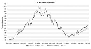 新華富時全球股票指數和新華富時中國A50指數走勢圖(2006年10月至2009年7月) |