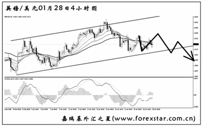 ▲歐元兌美元沿圖中的下降趨勢線完好下挫,主客觀方向均下看。匯價距離下方的強支撐1.3750尚遠,下跌空間較為廣闊。由于小時圖的下跌動能明顯減弱,歐元隨時有向趨勢線發起回調的風險,做空應等待良好的調整節奏出現后方可入場。