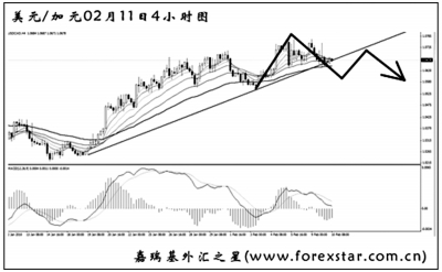 ▲美元兌加元正在考驗圖中的上升趨勢線,短線的頂背離次數很多,若跌破此線,將有一波較為明顯的下落回調。從小時圖上看,最近幾個交易日的波動劇烈,匯價震蕩無序。預計美元兌加元跌破趨勢線的概率較大,可在回抽時尋找入場做空的機會。 |
