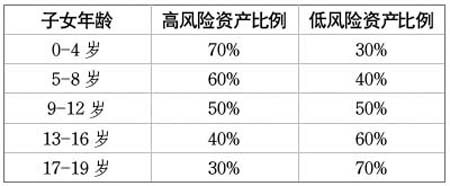 以基金定投方式償債后,王女士家庭每月還有800元凈結余,建議其從中每月拿出400元進行教育金儲備,方式仍可采用基金定投。由于王女士孩子只有三歲,籌備大學教育金還有將近16年的時間,故可以選擇部分高風險高收益的資產來進行配置,建議其50%選擇激進型,剩余選擇穩健型。若按保守的年收益率4%、每月定投400元來進行測算,在孩子19歲時可獲得將近11萬元的教育基金。 很多父母在為孩子選擇教育金的準備方式上過于激進或過于保守,這都是不可取的。投資風格激進的父母將全部資金配置于高風險資產中,一旦遇到資本市場行情持續惡劣和低迷的情況,本金會出現重大虧蝕。而投資風格保守的父母又會將全部資金進行銀行儲蓄,分析近20年的歷史來看,不僅國內外的教育費用均是逐年遞增的,且通貨膨脹也在侵蝕著我們儲蓄賬戶中的資金。由此,合理選擇教育金的準備方式尤為重要,建議牢記兩個原則:一是無論您的風險承受能力如何,一定要保持至少30%的無風險資產的配置;二是越是臨近教育金使用的期限,越是要降低高風險資產的比例。 下列資產配置比例可供年輕的父母們做參考:
