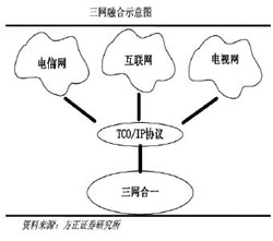 什么是“三網融合”?方正證券在報告中是這么定義的:“三網融合”是指電信網、計算機網和有線電視網三大網絡通過技術改造,提供包括語音、數據、圖像等綜合多媒體的通信業務。 方正證券認為,“三網融合”是業務的整合,它不僅繼承了原有的話音、數據和視頻業務,而且通過網絡的整合,衍生出了更加豐富的增值業務類型,如圖文電視、VOIP、視頻郵件和網絡游戲等,極大地拓展了業務提供的范圍;“三網融合”應用廣泛,遍及智能交通、環境保護、政府工作、公共安全、平安家居、智能消防、工業監測、老人護理、個人健康等多個領域。 以后的手機可以看電視、上網,電視可以打電話、上網,電腦也可以打電話、看電視。三者之間相互交叉,形成你中有我、我中有你的格局。隨著三網時代的到來,國人的生活將會更美好。