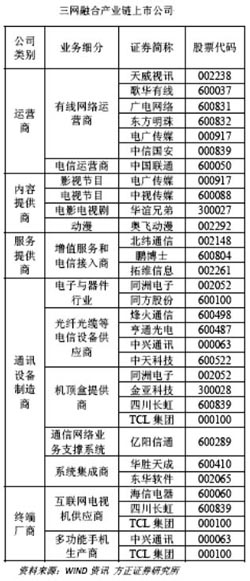 “三網融合”的推進,無疑將拉動一條產業鏈升級。但是,在東方證券看來,真正利好的是內容產業。 該券商的報告表示,市場可能認為“三網融合”對有線網絡是特大利好,但在雙向進入的情況下,有線企業將直面電信企業的競爭。我國當前地域分割的有線網絡企業運營能力和資本完全無法與電信企業相抗衡,“三網融合”真正利好的是內容產業。 因為“三網融合”意味著渠道的更加多元化。對內容產業而言,意味著有更多的分發渠道,有更多的受眾資源,無論他、她以前是有線網的用戶,還是電信、互聯網的用戶,內容企業可以有更多的機會與其接觸。就像3G網絡的推出,眾多的互聯網企業可將其平臺移植到3G網絡,增加了受眾人群。 第一創業則在報告中具體展望說,隨著“三網融合”進程的加快,有線電視公司未來將有望提供語音服務,電信運營商IPTV的發展也將加快,電信和廣電企業將既有競爭又有合作。 報告表示,年初的國務院會議明確了符合條件的廣播電視企業可以經營增值電信業務和部分基礎電信業務、互聯網業務。原來部分有線電視公司已經在提供寬帶上網的互聯網服務,此次提法意味著未來有線電視公司有希望提供VoIP電話服務!叭W融合”將使有線電視公司的業務范圍大為拓展,增加收入來源。 同時,電信運營商在一些城市已經推出了IPTV電視收看業務,預計未來IPTV將在更多的城市推廣,但其網絡基礎和收視質量需要有較大的提高才能與有線電視競爭。 廣電企業有豐富的節目資源,而電信運營商有市場化的優秀營銷能力,未來兩者雖然在進入對方的固有領域時存在一定的競爭,但同時又存在互相合作互補的需要。 方正證券也認為,隨著內容運營許可權的放開,廣電運營商的增長空間將迅速開啟,付費頻道、影視、電視支付、游戲、購物等增值業務都可以成為運營商新的利潤增長點。