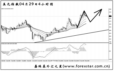 上周五美國證券交易委員會起訴高盛的事件對金融市場造成的進一步影響短暫,本周市場再度將焦點放在希臘債務危機問題上。與歐洲金融市場愈發動蕩形成鮮明對比的是,美國經濟復蘇前景更為樂觀,美元因此有望再創短線新高。 歐盟統計局上調希臘預算缺口以及穆迪下調希臘主權債務評級的消息令希臘金融市場本周再度經歷混亂不堪的局面。面對市場擔憂情緒所造成的借貸成本不斷上升的情形,希臘總理帕潘德里歐正式請求啟動歐盟/國際貨幣基金組織共同救助機制。接下來,歐盟、國際貨幣基金組織和歐洲央行將會對這一請求進行審核,之后待歐元區其他15個成員國批準之后,救助計劃中由歐元區承諾的300億歐元救助資金才能開始向希臘提供。此前,歐盟統計局公布的數據顯示,希臘2009年預算赤字占GDP比例高達13.6%,這較之前希臘政府預期的12.7%高出將近1個百分點。更令投資者感到絕望的是,鑒于一系列原因,歐盟統計局還表示,對希臘的財政數據的準確度持保留態度,不排除進一步上修的可能。另外,美國穆迪投資服務公司也下調希臘主權債務評級,并表示可能會進一步下調,原因在于希臘的借款成本可能最終遠超其之前的預期。穆迪將希臘主權債務的評級從“A2”下調至“A3”,較投機或“垃圾”級僅高四個級距,穆迪還將評級列入負面觀察名單。不過,市場人士仍對規模為450億歐元的援助機制存疑,因這可能無法解決希臘面臨的削減預算赤字的長期問題。 在歐洲金融市場愈發動蕩的背景下,美聯儲在結束為期兩日的會議后于北京時間4月29日凌晨宣布維持利率在0至0.25%區間不變,并再度重申利率將在較長時間內持于異常低位,但對經濟復蘇和就業市場的言論更為樂觀。美聯儲稱,經濟活動持續增強,就業市場開始改善。銀行借貸繼續收縮,但金融市場仍支持經濟增長。對就業市場的描述較3月有所“改觀”,當時美聯儲只不過表示,就業市場正在“趨穩”,但美聯儲重申雇主對增加人手仍在猶豫。美聯儲重申了市場密切留意的利率可能維持異常低點“一段長時間”的措辭,主因低通脹和高失業率。美聯儲重申在一段時間內通脹將可能保持溫和,因大量的資源閑置令成本壓力受限。美聯儲聯邦公開市場委員會以9:1的投票通過利率決定,堪薩斯城聯儲主席霍恩連續第三次在會議上持反對意見,他稱在較長時間內保持利率在異常低水平的承諾不再合理,認為這可能“造成未來的失衡”,在一段時間內保持低利率的承諾限制了美聯儲開始小幅升息的靈活性。美聯儲重申,委員會將密切關注經濟前景,在必要時利用政策工具促進復蘇和價格穩定。美聯儲稱,鑒于金融市場的功能性改善,除定期資產支持證券貸款工具以外已結束所有特殊流動性工具。 美元指數繼續沿日線圖的上升通道運行,目前中線道氏理論的最后一個顯著低點在80.00,此位置為美元指數上漲過程中的強支撐。MACD發出了大角度的頂背離信號,預示多頭動能有所減弱。美元指數有向下回探通道下沿的風險,但跌破的概率不大,后市再創新高為大概率事件。