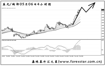 ▲美元兌瑞郎加速上沖,日線圖連續收出3根實體大陽線,多頭動能強勁。美元兌瑞郎的上漲空間廣闊,若做多是一個較好的選擇。短線均線系統向上排列,需要等待良好的次要節奏調整后方可入場。后市美元兌瑞郎的上漲斜率會有所減緩,但不影響其漲勢。