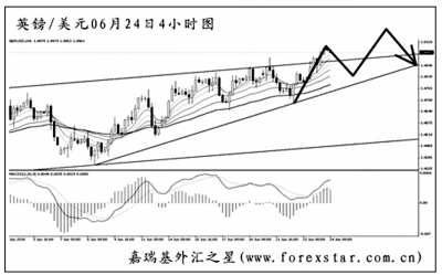 ▲英鎊兌美元運行到了大級別旗形中繼的上沿,并已將上沿小幅升破。目前還不能確定旗形中繼失敗,需重點關注1.5055一線的阻力,若英鎊將此位置突破,則中線的下跌將告一段落,后市轉為看漲思路。預計短線匯價還將有一波回落,考驗趨勢線的作用。