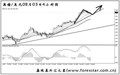 ▲英鎊兌美元已將原先的上升通道上沿升破,近來行情的上漲動能加強,上方空間廣闊。從日線圖波浪角度分析,目前英鎊處于三浪延長之中,即使發生四浪回調,后市還有第五浪的一波上沖。首先關注圖中上方趨勢線的支撐作用,如若跌破,英鎊有望向1.5600一線發起回調。