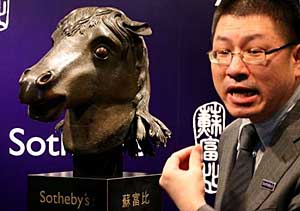 | 馬首銅像將于10月4日至8日在香港蘇富比秋季拍賣預展中展出。 | 香港蘇富比近日宣布,全國政協常委何鴻燊已以6190萬港元的價格,購入原圓明園海晏堂御制12生肖“水力鐘”噴泉的馬首銅像,并決定將其捐贈給國家。 據香港蘇富比提供的消息,此件文物原定于今年10月通過香港蘇富比拍賣,但因何鴻燊有意將馬首銅像捐贈國家,原收藏者遂同意拍賣前將銅像售予何鴻燊。 何鴻燊購下文物后表示,很榮幸能參與搶救流失海外文物的工作,繼豬首銅像之后,將馬首銅像捐贈國家。他希望能借此帶動更多的人參與保護中國文物的工作。 據悉,馬首銅像將于10月4日至8日在香港蘇富比秋季拍賣預展中展出,并從10月9日起在澳門葡京酒店展出。 圓明園海晏堂御制馬首銅像,是清朝乾隆年間修建在圓明園的12生肖報時噴泉(俗稱“水力鐘”)邊的飾物。12生肖動物銅像人身獸首,以盤坐之態作雙半月形分列噴泉之左右,各自按其代表的12時辰,依次輪流報時,馬首銅像本為噴泉左邊列第三的生肖銅像。 1860年英法聯軍攻入北京城,報時噴泉慘遭破壞,生肖頭像流失海外。2003年,中國保利藝術博物館用3317萬港元,從香港佳士得和蘇富比兩家拍賣行購得銅牛首、猴首和虎首三件圓明園文物。 目前圓明園獸面人身的12生肖銅像中,豬首、牛首、猴首和虎首四件已回歸祖國,其中的豬首銅像也是由何鴻燊購回并捐贈國家。目前,已知銅鼠首、兔首由法國人收藏;銅龍首、蛇首、雞首、狗首、羊首下落不明。