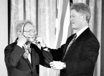 這張1996年拍攝的照片顯示,在美國首都華盛頓白宮,保羅·薩繆爾森(左)與時任美國總統克林頓在一起。 新華社/法新 |