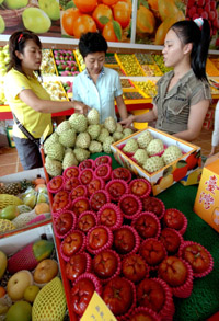 今年4月15日,大陸出臺惠及臺灣同胞的15項政策措施,福建廈門建立臺灣水果銷售集散中心是其中一項舉措。幾個月來,廈門市著力建設臺灣水果交易中心和物流中心,積極開辟“綠色通道”,實施便捷通關措施,截至目前,廈門口岸進口臺灣水果已達52批次442噸,價值42.4萬美元,其中包括菠蘿、芒果、檳榔等16個品種,70%以上銷往北京、上海、青島、深圳等城市。