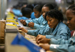 圖為在海信南非發展有限公司位于約翰內斯堡的工廠,工人電視機生產線上工作。海信公司自1997年底在南非建立第一條生產線,并不斷在南非市場樹立自己的品牌形象。憑借其堅持不懈的品牌戰略,海信在南非的銷量、銷售收入和利潤從98年起以平均每年20%到30%的速度增長。