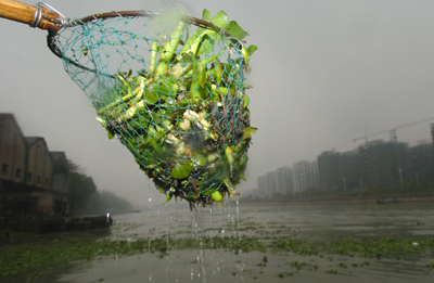 11月29日,河道養護人員正把一袋水葫蘆從運河中撈起。盡管工作人員的奮力打撈,但水葫蘆還是逼近了杭州市中心。近段時間來,由于運河杭州段支線的鄉村河流水質富營養化嚴重,導致水葫蘆大面積生長蔓延,加上今年的暖冬天氣,為水葫蘆的生長提供了環境,加速了水葫蘆的繁殖速度。目前,水葫蘆的瘋長已經對運河的行船安全造成了隱患。