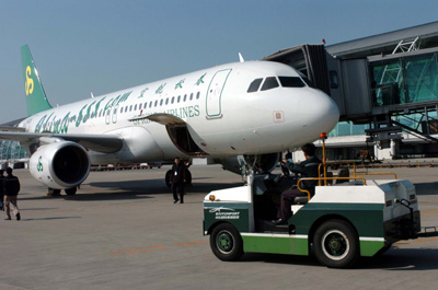 春秋航空公司在11月30日開通的上海-廣州航線上推出低價機票。從廣州飛往上海的最低票價僅為299元,加上150元的機場建設費和燃油附加費后,比廣州到上海的火車軟臥票價還低。圖為春秋航空公司的空客A320?吭趶V州白云機場,即將飛往上海。