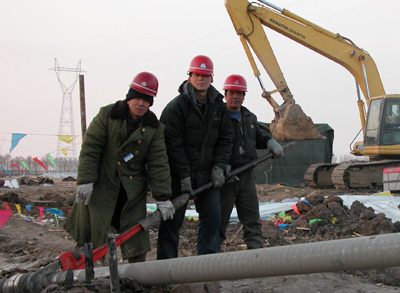 2日,幾名工人正在鋪設穿過松花江底的天然氣管線。
