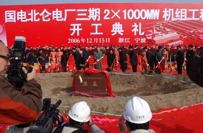 15日,國電北侖電廠三期工程兩臺1000MW超超臨界燃煤發電機組開工典禮在寧波舉行。兩臺燃煤發電機組建設的動態總投資為80多億元,計劃于2009年全部建成投產。