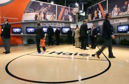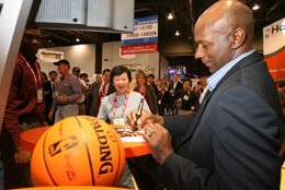 在海爾300多平方米的展位上,數臺超大屏幕高清電視上播放的NBA比賽畫面,動感十足,吸引了許多人的目光。等候海爾展區NBA巨星德雷克斯勒簽名的人排起了長隊。