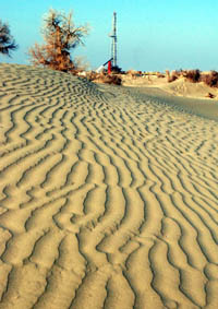 新疆塔里木哈得油田2006年已生產原油200萬噸,成為我國第一個年產200萬噸原油的沙漠油田。圖為位于新疆塔克拉瑪干沙漠腹地的哈得油田一角。