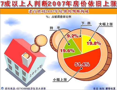 國務院發展研究中心宏觀經濟部研究員張立群認為,2007年國民經濟仍將保持10%左右的速度增長,物價漲幅也將有所擴大,居民消費價格指數將上漲2%左右,漲幅高于2006年1.1個百分點,以達到經濟增長與物價水平的匹配。2007年糧食價格將上漲6%左右,工業品出廠價格、生產資料價格、農資價格以及服務價格都將穩中有升。在這樣一個價格普遍上漲的大背景下,房價不可能逆市下行。