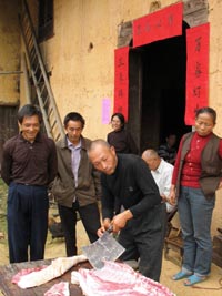 這是湖南省平江縣岑川鎮高形村一戶村民殺豬請客,慶祝通電。 日前,蘭州東至銀川東750千伏變電站鋼構架在銀川開始吊裝,這些鋼構架高58.7米,重28.35噸,均為國內同級變電站之最。圖為寧夏電力公司的員工在50米的高空組裝變電站的鋼構架。