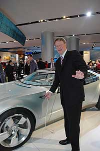 美國通用汽車公司新推出的雪佛蘭“Volt”概念車,車上裝備有專為電池充電用的酒精和汽油混合燃料發動機。經濟參考報資料照片