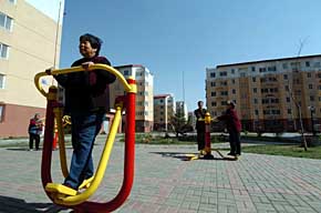 天津市河東區彩麗園廉租房住宅小區的居民在健身。