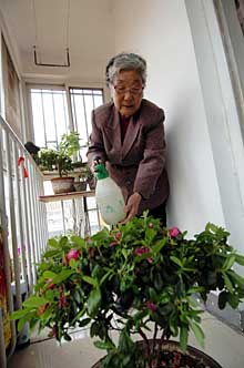 家住天津市河東區彩麗園廉租房的竇紅珍老人在澆花。本報記者 王曄彪