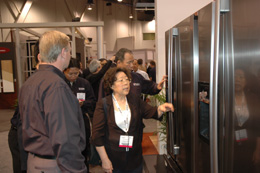日前在美國拉斯韋加斯開幕的國際廚衛設備展上,海爾推出的全球首臺超級空間法式對開門冰箱成為展會的一大亮點。這種冰箱在世界屬于首創,以容積大、技術先進、價格高等因素成為高端冰箱市場的代言產品。圖為展會上海爾集團總裁楊綿綿在向客戶和觀眾介紹海爾新近推出的超級空間法式對開門冰箱。