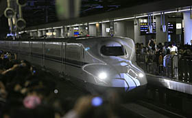 “希望”號第99次列車7月1日清晨6點駛離東京品川車站,踏上了前往南部博多車站的旅途。這標志著日本N700系列新一代新干線列車正式投入運營。 清晨5點前后,站臺邊就擠滿了各路記者和新干線迷。5點45分,整裝待發的“希望”號99次列車在人們的翹首以待中緩緩駛入23號站臺。N700系列新干線列車通體呈白色,車頭采用流線雙翼形。每節車廂長25米,寬3.3米,高3.6米,一個編組總重量達715噸。列車采用2.5萬伏60赫茲交流供電方式,一個編組的輸出功率為17080千瓦,設計最高時速340公里,額定載客人數1323人。 N700系列新干線列車是日本東海旅客鐵道公司和西日本旅客鐵道公司以700系列列車為基礎開發的升級版本,在快捷、舒適、環境性能和節能等方面實現了全面提升。由于采用了新設計和新型自動控制系統,這種列車在平坦路軌上從靜止加速到每小時270公里約需要180秒,比700型列車如此加速的時間縮短40%,在彎道行駛的最高速度可達每小時270公里。N700型列車的所有車廂都配備了高性能的半主動減振器,使得剎車時車廂更加平穩。車廂內還有空調換氣系統,更符合人形體特點的座椅以及多媒體彩色信息提示裝置等。在節能方面,N700型列車采用了車頭兩側“雙翼”設計以減少行駛中的空氣阻力,并且采用新的材料和制造工藝以減輕車體重量,從而使列車更加節能。 據介紹,7月1日投入運營的N700系列新干線列車共有8輛,它們全部在東海道(東京至新大阪)和山陽(新大阪至博多)運行。今后這一系列的列車將逐漸替換目前的300、500系列,成為新一代新干線的主力車型。