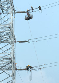 天津電力建設史上規模最大、線路最長的電網工程——東麗500千伏輸變電工程,已進入后期施工階段。圖為施工人員在酷暑下進行放線施工。