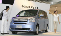 1美元約兌換123日元)。圖為模特在豐田新車發布會上展示新推出的家用旅行車NOAH。 |