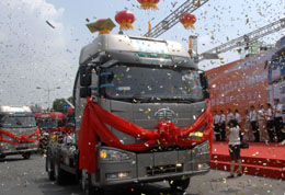 由一汽自主研發的解放J6重型卡車在第一汽車集團公司門前舉行首批用戶交車儀式。新華社記者:遲海峰
