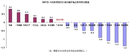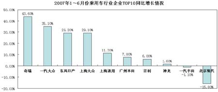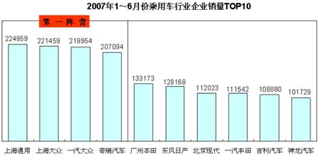 2007年上半年,從乘用車行業十五強的市場占有率來看,各企業的排名正好是“七上八下”,其中,“七上”的企業根據業績排名分別為:奇瑞、一汽海南、東風日產、一汽大眾、上海大眾、長安福特和廣州豐田;“八下”的企業分別是:吉利、神龍、天津一汽、悅達起亞、上海通用、廣州本田、一汽豐田和北京現代。 十五強企業的“七上八下”也使上半年車市平穩發展的環境下出現了“幾家歡喜幾家愁”的局面。