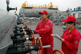 中國石油長慶油田公司石油勘探工作又獲重大突破,位于鄂爾多斯盆地西南部的西峰油田,截至2006年底三級儲量已達到5.68億噸。圖為中國石油長慶油田公司第二采油廠兩名職工在西一聯合站來油總機關切換來油進站流程。