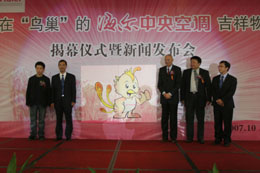 北京2008奧組委高級顧問魏紀中(右三)為海爾揭曉“鳥巢”中央空調吉祥物。(本報資料照片) |