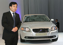 沃爾沃汽車公司近日在北京舉行新款沃爾沃S40轎車中國市場上市活動。由重慶長安福特馬自達汽車公司生產的新款S40包括T5、2.4i智雅版和2.4i智尚版三款車型。其中,新款T5車型采用無鑰匙駕駛控制系統,增加了轎車的時尚感和科技含量。圖為沃爾沃轎車技術人員在介紹新款沃爾沃S40轎車。