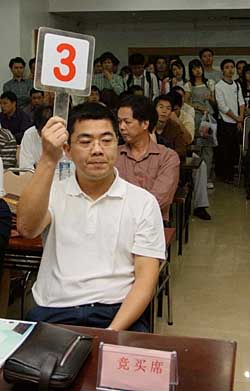 | 日前,福州市公開拍賣出讓11幅地塊。備受關注的福州個人合作建房組織也在其中,但在本次拍賣會上并沒有舉一次牌。圖為3號代表以5億3400萬拍下34.17畝土地,搶到了當場舉牌第一名。新華社記者