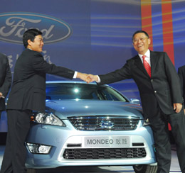 | 右為長安福特馬自達總裁沈英銓 | 長安福特馬自達汽車有限公司總裁沈英銓透露:實現福特汽車每年向中國市場投放兩款全新車型的承諾,將有兩款小車陸續生產和投放,全年銷量進入前十的幾率很大。